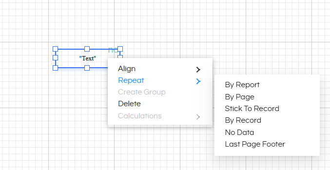 In this blog, we are going to give details of all the repeat by options that are available when we right click on any component on the canvas. The repeat by options allows to create report header, page header, page footer, report footer, report summary as well as detailed row wise data as well.