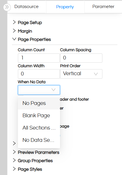 - No Data: If main dataset is returns an empty resultset, user can show message/information in the report. Select Repeat No Record. Now select design area and in Page Properties under property pane , user has to select No Data section in When No Data property.